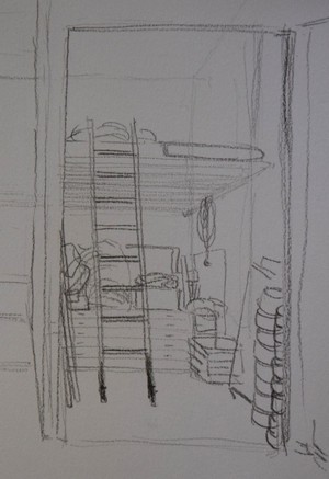 Nicht lang, gegen Mittag, kommt man auch schon wieder unten an. Wie warm und trocken die Stadt ist! Und wie kalt und nass der Berg! Unten belebt und bunt, oben karg und still. Und wenn ich jetzt nach oben sehe, weiß ich, da sind viele Wanderer, Schafe und Winzer, Naturforscher und Schönschrecken, ein Krempelladen, Vulkanpfade hinabhüpfende Strandtouristen, und spielende Kinder auf der Burgtreppe. Würde mein Aufenthalt hier jetzt beginnen, wüsste ich, wie alles zu zeichnen wäre. Doch es geht heute schon zurück nach Kleinschönach.