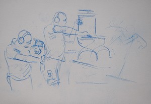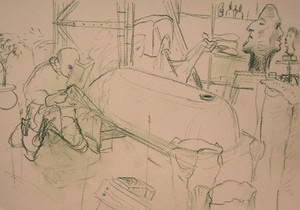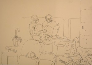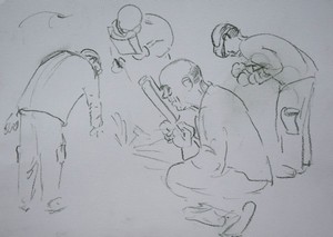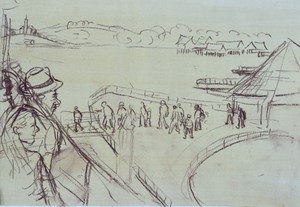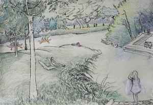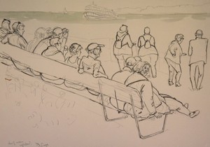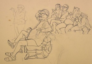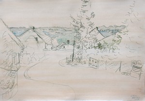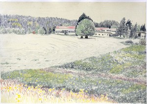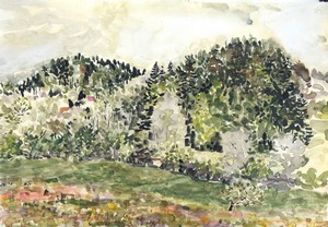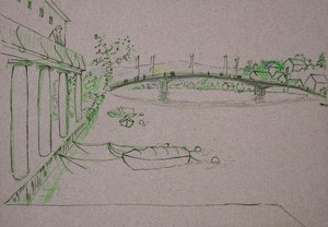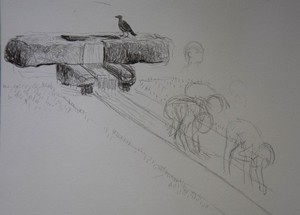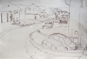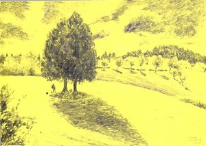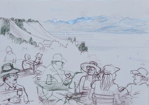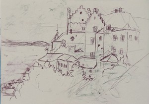 Nach einer Zeichnung nehme ich wieder den Abstieg, nun auf der anderen Seite, an schnöder Betonstraße, die hat, wenn auch ziemlich steil, nicht viel vom Hohentwiel, touristisch, Restaurant und Blumen. Alte Leute mit Sonnenbrillen, weißen Hosen und Blusen steigen aus den Bussen. Hier steht auch eine große Linde, unter der Joseph von Scheffel an seinem „Ekkehard“ geschrieben haben soll. Damals doch wohl nicht zwischen Hunderten von Leuten?