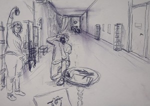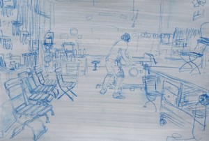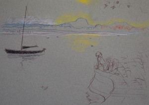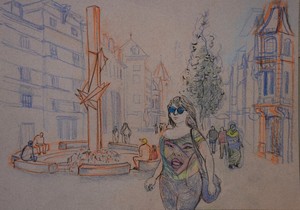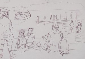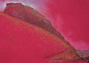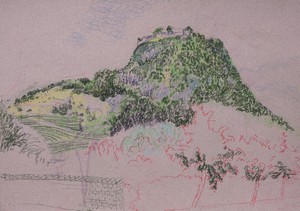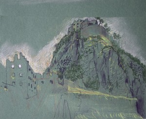 Nicht lang, gegen Mittag, kommt man auch schon wieder unten an. Wie warm und trocken die Stadt ist! Und wie kalt und nass der Berg! Unten belebt und bunt, oben karg und still. Und wenn ich jetzt nach oben sehe, weiß ich, da sind viele Wanderer, Schafe und Winzer, Naturforscher und Schönschrecken, ein Krempelladen, Vulkanpfade hinabhüpfende Strandtouristen, und spielende Kinder auf der Burgtreppe. Würde mein Aufenthalt hier jetzt beginnen, wüsste ich, wie alles zu zeichnen wäre. Doch es geht heute schon zurück nach Kleinschönach.