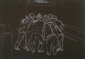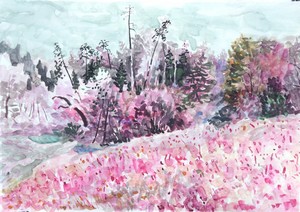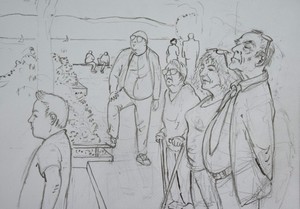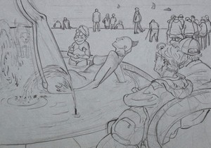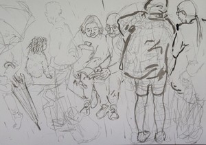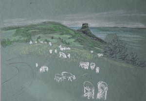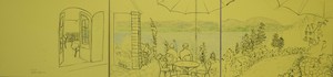 Der Ausblick auf Singen ist schon jetzt beeindruckend, aber es sammeln sich die Wolken, wird gewittrig, ich setze mich erstmal für eine Zeichnung ins Gras, um noch zu überlegen, da kommen immer wieder Leute strahlend grüßend an mir vorbei. Stramme alte Damen mit Wanderstöcken, viele alleine, und junge Paare ganz ohne Ausrüstung, ohne Rucksäcke, ohne Proviant, als wäre der Gipfel der Bäcker um die Ecke. Nun, wenn das so ist ... weiter geht´s.
