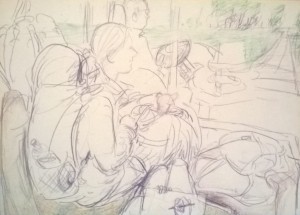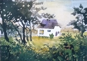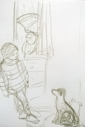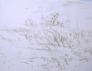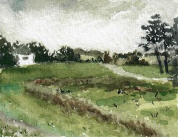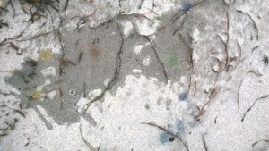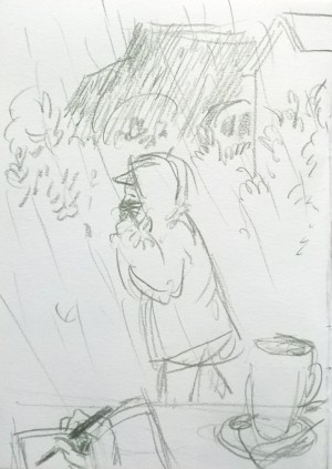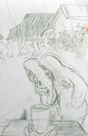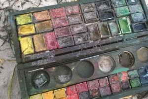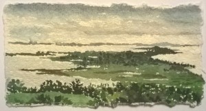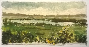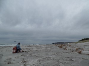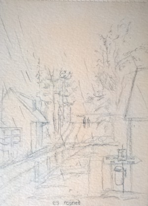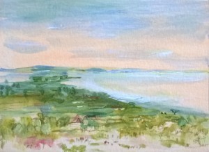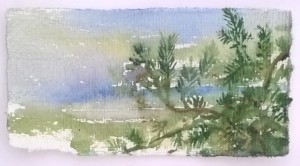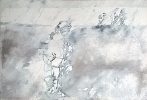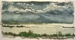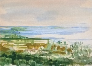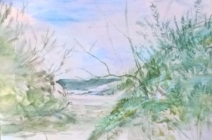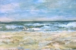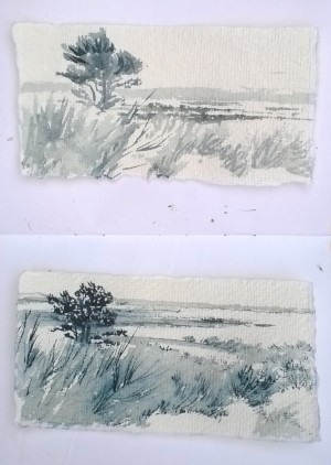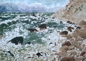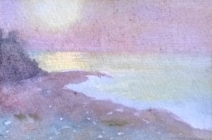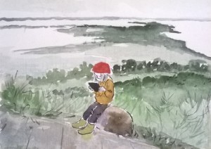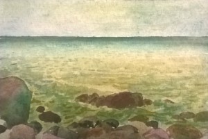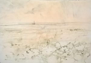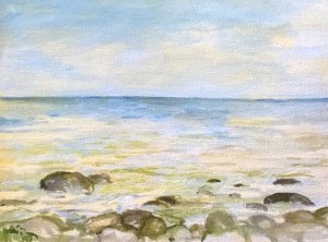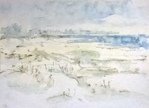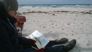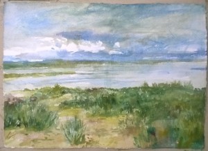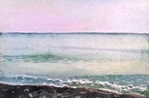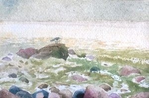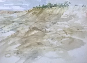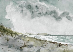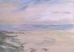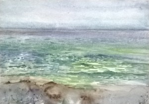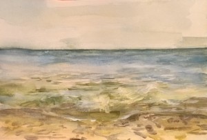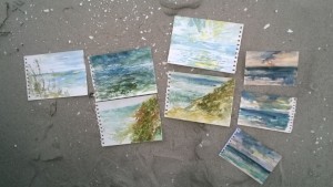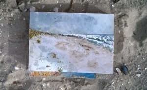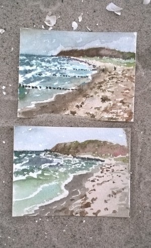 Unser letzter Tag. Wir sitzen im Nieselregen im feuchtkalten Sand und malen das nebelige Meer. Die Bilder geraten ein paar mal gut, werden aber immer wieder abgespült, da ist aus Niesel Regen geworden. Bald hält garkeine Farbe mehr, Papiere unter Wasser.